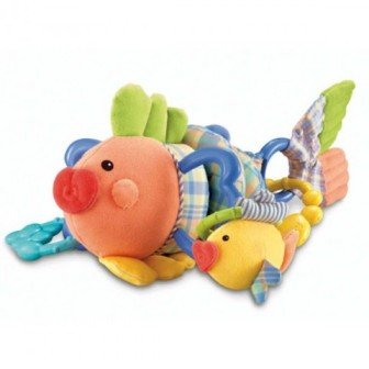 The Linkadoos On-the-Go Goldfish is the ideal toy for attaching to babygear products. The spiral tail easily and securely wraps around handles, trays and bars. The Goldfish features a jingle bell with bright bold colors and high contrast patterns to stimulate baby's senses. Includes a linkable soft toy and two plastic links for teething and attaching.