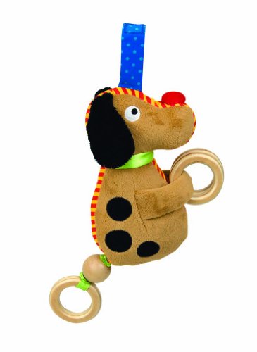 Pull on this puppy's tail to make it jiggle. This toy features wooden clacking rings and crinkle paper and attaches to most strollers and carriers.