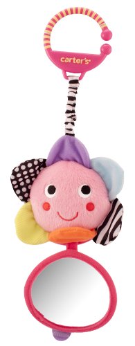 Carters Baby attachable Tag Along Flower Mirror Ball has a mirror, a rattle and vibration for baby to explore. Soft fabrics and textures, bright colors and faces and elastic for extra play, make this toy great for stimulation and imagination. Attaches to car seat, stroller or swing.