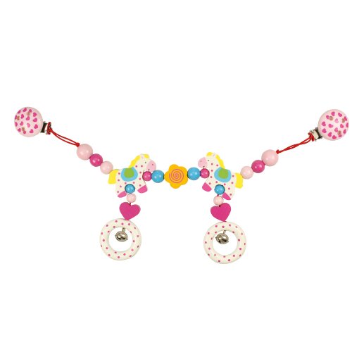 This Wooden horses clip on pram chain is made by Heimess, a German company who specialise in quality wooden toys. The chain features two happy smiling horses with colourful beads and a central star.This pram chain is designed to be attached to a pram by two strong clips (included) to provide your baby with amusement during trips outside.