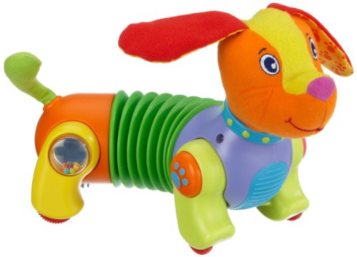 Tiny Love Follow-me Fred is a self-rolling toy that encourages crawling and improves overall cognitive development and motor skills. Tap it a little and it will walk and bark, encouraging your baby to follow along. Turn it a little and it will walk in a circle, inviting your baby to crawl and play. Follow-me Fred has crinkly ears and a soft green tail that are fun to grab. It also has a special button on its left paw that plays a puppy tune when pressed.
