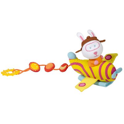 Keep kdis amused with the Latitude Enfant Pepe the Pilot-Activity Strapper. With a bunny sitting on a plane, fun takes flight. It's specially designed to be compact so that children can easily carry it anywhere. A pilot controls the yellow and red striped plane. With a soft squeeze, the air plane's take off sound is sure to delight a child. Attach the pilot and plane with velcro for easy fastening and unfastening.