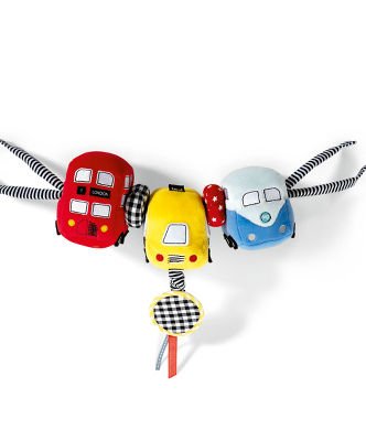 Keep your little one entertained at home or on the go with this interactive travel toy. Soft and colorful pram toy designed to entertain babies on the move. Discover hidden features in the fun Bus, Taxi and Camper.