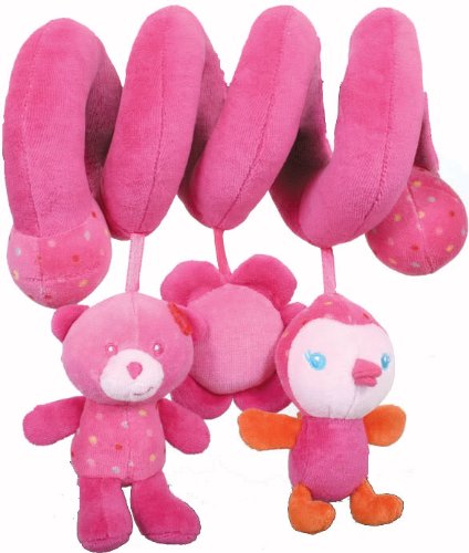 Original and luxurious plush spiral baby toy with 3 soft rattle toys. Curl it around the crib, stroller or carrier to keep your baby girl busy and happy! Especially designed by Tuc Tuc to help your baby learn and develop her tactile senses and hand eye coordination naturally. Made of high-quality materials with a classic pleasant rattle sound. 80% soft cotton velour. Measures 12" long. 31cm long. Imported from Europe. Hot pink colors, cute little bird, teddy bear and flower soft plush rattle toys in this Chip Chip Collection. Matching accessories also available.Read more Pink Spiral Activity Wrap Baby Girl Toy. Newborn Rattle Toy. Chip Chip Collection.