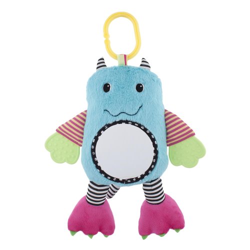 Soft crinkle body with attachable link for take-along play. Large mirror attracts & helps develop vision. Teethable hands.